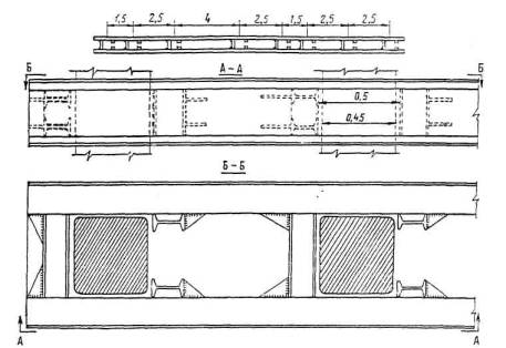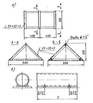 Рис. 5. Подставки для хранения и перевозки свай, оболочек и шпунта: а - для свай; б - для оболочек 2.9. Место складирования запаса свай, шпунта и оболочек необходимо выбирать, возможно, ближе к копрам или кранам. Элементы следует укладывать головами в одну сторону, обращенную к копру или крану, с таким расчетом, чтобы не производить их перекантовки при строповке или подъеме. Сваи и шпунтины при переноске и хранении должны быть предохранены от ударов; перетаскивать их волоком или кантовать ломом запрещается. 2.10. На складе, для ускорения работ на месте погружения, следует производить заблаговременную укрупнительную сборку шпунтин в пакеты и секций - в оболочки, а также прорезку отверстий в стальном шпунте и изготовление угловых шпунтин. 2.11. Шпунтины в пакеты собирают в горизонтальном положении на стеллаже, оборудованном катками или без них, с помощью крана и лебедки. Сборку пакетов производит звено, состоящее из машиниста крана 5 разр. и двух монтажников 3 разр. Монтажники с помощью крана и оттяжек выкладывают на стеллаже крайние шпунтины и между ними заводят среднюю. Шпунтины в пакетах закрепляют сваркой или инвентарными хомутами. Для сборки пакетов также рекомендуется использовать стенды, позволяющие набирать шпунтины в вертикальном положении. 2.12. Укрупнительную сборку оболочек рекомендуется производить на специальных стендах, обеспечивающих соосность секций и облегчающих обработку стыков. Работы выполняются звеном монтажников (5 разр. - 1 чел.; 3 разр. - 2 чел.). Сварку фланцевых стыков и приварку ножа производит электросварщик 5 разр. В случае наращивания оболочек в процессе погружения на ранее подобранных секциях необходимо нанести несмываемой краской метки для правильного и быстрого их соединения. 2.13. Противокоррозионное покрытие свай, оболочек и шпунта рекомендуется наносить, как правило, на заводе, и только в исключительных случаях при укрупнительной сборке элементов, на приобъектном складе. 2.14. Для измерения глубины погружения свай, оболочек и шпунта необходимо нанести на их поверхность разметку длины. На глубину воды отметки наносят через метр, а выше: у сваи и шпунта - через полметра, у оболочек - через 10 см. Отметки метров обозначают цифрами. Разметку наносит копровщик 3 разр. несмываемой краской при помощи трафарета-шаблона. III. СВАЙНОЕ И БУРОВОЕ ОБОРУДОВАНИЕ1. Выбор свайного оборудования3.1. Сваебойное оборудование выбирается в зависимости от вида и размеров погружаемого элемента, от конструкции сооружения, от условий и объема работ, а также возможностей строительной организации. 3.2. Технология производства свайных работ должна обеспечивать максимальное сокращение затрат времени на вспомогательные операции (подтаскивание свай к копру, подъем и установку на место забивки, передвижку копра к следующей точке), которые обычно составляют 65-80% общего времени на рабочий цикл. 3.3. Для забивки свай, оболочек и шпунта следует использовать универсальные и не универсальные сухопутные или плавучие копры, изготовляемые на заводах или в строительных организациях. Основные характеристики таких копров приведены в приложении 3. 3.4. При наличии на объекте стреловых или портальных кранов рекомендуется использовать их для погружения (особенно с применением вибропогружателей) свай, оболочек и шпунта, обеспечив их направляющими стрела