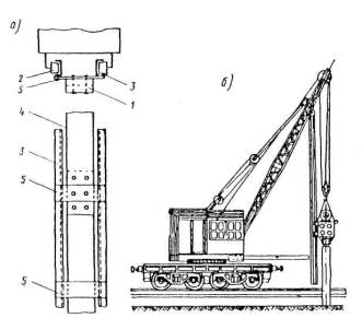 Рис. 7. Использование железнодорожного крана для погружения свай и шпунта: а - присоединение рамы вибропогружатели; 1 - вибропогружатель; 2 - направляющие ролики; 3 - швеллеры направляющей рамы; 4 - подвесная стрела; 5 - соединительные планки; б - установка направляющих стрел 3.5. Для производства свайных работ на воде при отсутствии плавучих копров или кранов по согласованию с морским (речным) регистром СССР допускается устанавливать сухопутные копры или краны на плавсредства. 3.6. При небольшом объеме свайных работ можно производить забивку не универсальным копром с ручным приводом. 3.7. Погружение свай и оболочек рекомендуется производить с использованием направляющих устройств в виде стрел, каркасов и кондукторов. 3.8. Направляющие стрелы на стреловых и портальных кранах или в виде копров (рис. 8) рекомендуется использовать для погружения наклонных призматических свай и оболочек диаметром до 1,6 м (включительно).