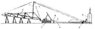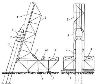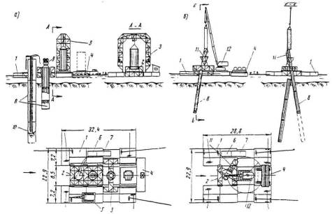 У копров типа СССМ на рельсовом пути монтируют нижнюю тележку (или раму), копра, устанавливают поворотную платформу, механизмы вращения, подъема стрелы и передвижения. Сборку производят кранами или с помощью монтажных приспособлений (лебедок, блоков, полиспастов, тросов, якорей). В последнем случае стрелу копра (рис. 9) собирают на козлах в наклонном положении с некоторым подъемом к вершине, где высота козел составляет около 9 м. Механическую лебедку копра устанавливают на расстоянии 10-12 м от тележки по оси стрелы: между лебедкой и тележкой укладывают распорки. Затем устанавливают подъемную мачту и к ней крепят трос от лебедки. Другим тросом мачту крепят к верхнему концу стрелы. Подтягивая лебедкой трос, поднимают стрелу в положение, близкое к вертикальному, и крепят к поворотной платформе копра. После этого монтируют котел, устанавливают лебедки, блоки, запасовывают тросы, подвешивают молот, монтируют паропроводы и производят опробование копра. Разборку копров производят в обратном порядке.