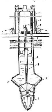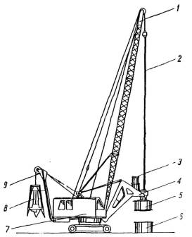 Рис. 10 Буровая установка МБС-1,7: 1 - главная стрела; 2 - телескопическая штанга; 3 - ротор; 4 - консоль; 5 - ковшовый бур; 6 - обсадной патрубок; 7 - корпус крана (экскаватора); 8 - грейфер (долото); 9 - задняя стрела 3.17. Скважины под набивные сваи или для оболочек рекомендуется бурить установкой МБС-1,7 (рис. 10) или самоходной вышкой. Разбуривание уширений в основании скважин или оболочек следует производить буровой установкой ЦНИИС, которую подвешивают на универсальный копер или на специальную вышку (рис. 11).