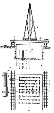 Рис. 13. Схема забивки свай с передвижных подмостей: 1 - копер; 2 - ходовая тележка; 3 - мост под копер; 4-погружаемая свая; 5 - штабель свай стрелками указан путь передвижения копра в) с передвижных подмостей, перекрывающих котлован и передвигающихся вместе с копром по путям, которые укладываются за ограждением котлована (рис. 13), - способ наиболее механизированный и производительный. 4.27. При сооружении фундамента, имеющего более трех рядов свай и в каждом ряду более трех свай, погружение следует вести в направлении от центра к краям по спиральной схеме или по последовательной схеме (рис. 14).