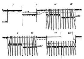 Рис. 15. Схема устройства свайного фундамента в шпунтовом ограждении. I - забивка стального шпунта; II - разработка котлована на глубину 3 м; III-установка крепления и забивка свай; IV-разработка котлована на глубину 5 м; V - укладка бетонного крепления на грунт (без воды); VI - разработка котлована на глубину 6,5 м; VII - укладка бетонной подушки, срубка свай (без воды); VIII - устройство железобетонной плиты и тела опоры 4.28. Пример сооружения фундамента береговой опоры городского моста приведен на рис. 15. Железобетонные сваи сечением 40×40 см и длиной до 20 м погружали по 15 шт. в ряд по последовательно-рядовой схеме. Сваи крайних рядов забивали с наклоном 6 : 1; соседние с ними - с наклоном 10 : 1: остальные - вертикально. Шпунт для ограждения котлована глубиной 6,5 м забивали на глубину 9 м дизель - молотом с весом ударной части 1800 кг на кране с направляющей стрелой. После погружения шпунта котлован разрабатывали на глубину 3 м с помощью гидромеханизации с установкой верхнего пояса креплений из инвентарных конструкций. Сваи забивали универсальным полноповоротным копром СССМ-680 с паровоздушным молотом весом ударной части 6 т. Копер был установлен на специальный передвижной мостик, который со стороны реки опирался через тележку на рельс, уложенный по обстройке верха стального шпунта, а со стороны берега - на рельс, уложенный по брусьям на грунте. Мостик на тележках передвигали вдоль котлована двумя трехтонными приводными лебедками. Поперек котлована перемещали копер по рельсам, уложенным на передвижном мостике. Рабочим местом являлись котлован, мостик под копер, пути под тележку мостика, лебедки для его перемещения и склад свай. После забивки свай грунт разрабатывали еще на глубину 2 м, затем на дне котлована по контуру бетонировали крепление высотой 0,5 м и шириной по 2 м. После этого котлован затопляли водой. Через 5 дней разработали грунт до проектной отметки, откачивали воду из котлована и бетонировали все остальное пространство от дна котлована до верха бетонного крепления и снова заливали водой. После твердения бетона откачивали воду, разбивали головы свай, бетонировали плиту ростверка и тело опоры. 3. Опоры мостов, сооружаемые на воде4.29. При небольшой глубине воды и скорости течения менее 1 м/сек организация труда и состав работ по сооружению свайного фундамента сохраняются такими же, как и при производстве работ на суше, только дополнительно выполняется отсыпка островка, когда это экономически оправдывается с помощью гидромеханизации или автотранспорта. 4.30. В состав работ при сооружении свайного фундамента на воде без отсыпки островка при расположении плиты ростверка в пределах грунта вместо планировки площадки выполняется установка и закрепление направляющего каркаса, который служит распорным креплением ограждения и подмостями. 4.31. При сооружении свайного фундамента, плита ростверка которого расположена в пределах воды, для ограждения котлована вместо шпунта используют инвентарные щиты и дощатые днища, закрепляемые на направляющем каркасе. Соответственно изменяется и состав работ. 4.32. В рабочее место включаются котлован, направляющий каркас, подмости и ограждение, плавсредства, на которых располагают сваебойное, крановое и вспомогательное оборудование (компрессор, насос, электростанция, бетонный завод и т.п.), запасы свай, шпунта и других 