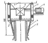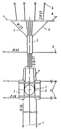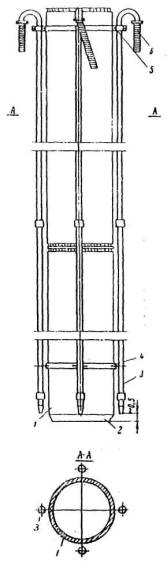 Рис. 39. Схема прикрепления подмывных трубок к вертикальной оболочке: 1 - оболочка; 2 - нож; 3 - подмывные трубки; 4 - направляющий хомут; 5 - удерживающий хомут; 6 - резиновый шланг В случае секционного погружения оболочек одновременно производят наращивание подмывной трубки новыми секциями. 6.5. Вертикальные оболочки диаметром 1,6 м и более погружают с наружным подмывом несколькими подмывными трубками, расположенными равномерно по периметру оболочки (рис. 39). При этом в состав работ входят следующие операции: а) укладка разводящей линии; б) установка и закрепление трубок на погружаемой части оболочек; в) подключение трубок к разводящей линии; г) подача воды в трубки и осаживание вибросистемы сначала под действием собственного веса, а потом и возмущающейся силы вибропогружателя; д) наращивание подмывных трубок одновременно с наращиванием оболочки и повторение цикла операции по погружению. Для предотвращения наплыва грунта внутрь оболочки в процессе вибропогружения с подмывом концы трубок следует располагать на 1,5-2 м выше ножа оболочки. Опускать трубки разрешается при наличии в полости оболочки грунтовой пробки высотой не менее 3 м. Подмыв необходимо прекращать, когда нож оболочки не дошел до проектной отметки на 0,5 м. Дальнейшее погружение оболочки производится после извлечения подмывных трубок, при этом подмыв оболочек, расположенных в радиусе 5 м, запрещается. 6.6. Организация труда, состав работ и затраты труда при погружении оболочек диаметром 1,6 м с использованием внутреннего подмыва приведены в п. 5.9. и табл. 6. VII. ОРГАНИЗАЦИЯ ТРУДА ПРИ УСТРОЙСТВЕ БУРОВЫХ СТОЛБОВ ИЛИ СТОЛБОВ ИЗ ОБОЛОЧЕК С ЗАБУРИВАНИЕМ В СКАЛЬНУЮ ПОРОДУ ИЛИ С УШИРЕННОЙ ПЯТОЙ В ОСНОВАНИИ7.1. В состав работ по устройству буровых столбов или столбов из оболочек с уширенной пятой в основании входят: а) установка технологического оборудования; б) бурение скважин с извлечением грунта; в) разбуривание уширения в основании скважины или оболочки; г) приемка скважины и уширения; д) установка арматурного каркаса в скважину; е) бетонирование уширенной пяты и скважины; ж) устройство плиты ростверка. При забуривании в скальную породу основания бурового столба дополнительно должно быть подготовлено буровое технологическое оборудование, проверено состояние поверхности скальной породы в скважине и, при необходимости, проведено ее выравнивание, а затем пробуренная скважина должна быть очищена от разбуренной породы. При устройстве столбов из оболочек с забуриванием в скальную породу отпадает необходимость в оборудовании и работах для бурения в нескальных грунтах, а грунт из полости оболочки извлекают грейфером или эрлифтом. Кроме того, иногда производится тампонаж зазоров между скалой и ножом оболочки. 7.2. В рабочее место для производства буровых работ включаются подмости, на которых размещаются станки для бурения и другое вспомогательное оборудование. Перечень необходимого оборудования, приспособлений и инструментов приведен в приложениях 10 и 11. 7.3. При устройстве буровых столбов и столбов из оболочек должно быть обращено особое внимание на сохранность стенок скважины и уширения в неустойчивых грунтах как в процессе бурения, так и при выполнении остальных работ. Крепление стенок скважины и уширений от обрушения необходимо осуществлять с применением глинистого раство
