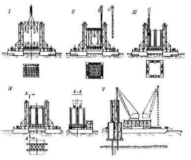 Рис. 19. Схема сборки направляющего каркаса и перемычки: I - сборка направляющего каркаса; II - устройство дощатого днища и установка щитов перемычки; III - устройство замыкающих элементов перемычки: IV - подвешивание каркаса на вышках; V - опускание каркаса в воду и погружение маячных свай 4.37. Для работ по установке и закреплению направляющего каркаса, по погружению шпунта и свай, а также всех остальных работ целесообразно организовать комплексную бригаду из четырех звеньев. Состав звена комплексной бригады, квалификация и разряды рабочих подбираются на месте работ в зависимости от наличия оборудования и оснастки и в соответствии с действующими ТКС и ЕНиР. Звено 1. Монтажники стальных конструкций - 4-5 чел. Выполняют работы по установке каркаса, подвешиванию его на маячные сваи и другие монтажные работы. Звено 2. Копровщики и машинисты копра и крана - 4-5 чел. Выполняют работы по погружению свай и шпунта. Звено 3. Бетонщики, арматурщики и плотники - 3-5 чел. Выполняют работы по подводному бетонированию, устройству опалубки, установке арматуры, бетонированию плиты ростверка и тела опоры. Звено 4. Монтажники, машинист компрессора, слесарь - 1-5 чел. Выполняют работы по сборке и установке эрлифта, извлечению грунта из котлована и заполнению его водой. 4.38. Достигнутые передовиками производства затраты труда при сооружении свайной опоры в шпунтовом ограждении для примера, указанного на рис. 19, и рациональный состав звена приведены в табл. 4.