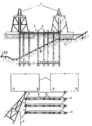 Рис. 22. Схема и конструкция переставного направляющего каркаса для погружения свай причала