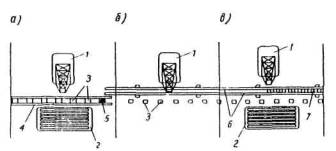 Рис. 24. Погружение свай и шпунта для причальной стенки типа «Больверк»: а - забивка одиночных свай; б - установка направляющих для забивки шпунта; в - забивка шпунта; 1 -плавучий копер; 2 - баржа со сваями; 3 - одиночные железобетонные сваи; 4 - кондуктор для погружения одиночных железобетонных свай; 5 - стальная свая-коробка для крепления кондуктора; 6 - направляющие для забивки шпунтовых свай; 7 - забитый шпунт