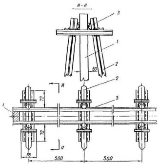 Рис. 25. Направляющий кондуктор для погружения шпунта: 1 - железобетонный шпунт; 2 - сваи-коробки; 3 - направляющие из шпунтин типа «Ларсен V»