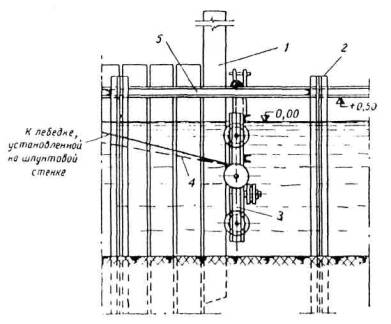 Рис. 26. Прижимная тележка конструкции ВНИИГС: 1 - железобетонный шпунт; 2 - сваи-коробки; 3 - прижимная тележка; 4 - натяжной трос; 5 - направляющие из шпунта типа «Ларсен V» а) грунт в котловане до проектной глубины разрабатывают земснарядом и отвозят на баржах; б) место погружения первой одиночной сваи «Больверка» тщательно проверяют двумя теодолитами. Сваи и шпуптины поднимают с баржи универсальным плавучим копром «Юбигау» и забивают паровым молотом одиночного действия с весом ударной части 6 т;