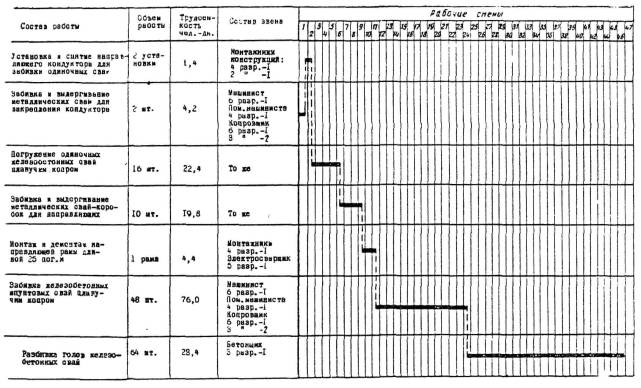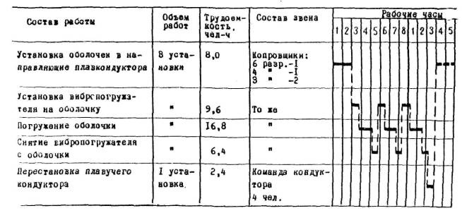 Рис. 27. Забивка свай и шпунтин типа «Ларсен V» температурной секции причальной стенки г) постепенно передвигая копер вдоль кондуктора, устанавливают сваи в ячейки и забивают их до проектной отметки (рис. 24, а); д) сваевыдергивателем, которым должен быть оборудован копер, выдергивают сваю-коробку, переставляют кондуктор дальше по фронту работ и снова забивают сваю-коробку в крайнюю ячейку; е) в зависимости от местных условий (заделки шпунта в грунте, степени волнения в акватории и т.п.) шпунт забивают с применением кондукторов или постоянных направляющих. В первом случае монтаж и демонтаж кондуктора для забивки шпунтин также производят универсальным копром. Этот кондуктор (рис. 25) состоит из двух направляющих и трех инвентарных козловых опор. Основные элементы его изготовлены из шпунтин типа «Ларсен V». Две сваи-коробки козловой опоры забивают с небольшим наклоном и на них устанавливают рамку-фиксатор, на которой закрепляют направляющие. По мере забивки шпунта переднюю опору кондуктора разбирают, передвигают направляющие дальше (см. рис. 24, б) и собирают опору на очередном месте; ж) шпунтины устанавливают в направляющие и забивают до проектной отметки по одной (см. рис. 24, в). Для обеспечения плотного прилегания шпунтин друг к другу следует использовать при забивке прижимную тележку конструкции ВНИИГС (рис. 26); з) со специальной площадки, навешиваемой на шпунтовую стенку, разбивают пневматическими молотками головы свай и шпунтин и обнажают арматурный каркас для соединения с элементами верхнего строения. 4.47. Фактические, достигнутые передовиками производства, затраты труда, количество рабочих в звене и их квалификация, а также график работ по забивке свай и шпунтин одной температурной секции причальной стенки см. на рис. 27. V. ОРГАНИЗАЦИЯ ТРУДА ПРИ ПОГРУЖЕНИИ ОБОЛОЧЕК ДИАМЕТРОМ 1 м И БОЛЕЕ1. Общие указания5.1. В состав работ по погружению оболочек входят следующие операции: а) установка укрупненной оболочки (или отдельных ее секций) в ячейку направляющего устройства; б) установка и закрепление вибропогружателя с наголовником на оболочке; в) погружение оболочки вибропогружателем; г) снятие вибропогружателя; д) удаление грунта из полости оболочки (при необходимости). Если оболочку собирают в процессе погружения, то после наращивания погруженной части следующей секцией все операции, кроме первой, повторяются. При применении подмыва выполняется дополнительно операции по установке и снятию подмывных трубок, подключению и отключению насосной установки. Грунт из оболочки, погружаемой вибропогружателем ВУ-1,6, удаляется без снятия последнего с оболочки. 5.2. Состав звена при погружении оболочек следует принимать в зависимости от диаметра оболочки и состава работ (табл. 5). Таблица 5