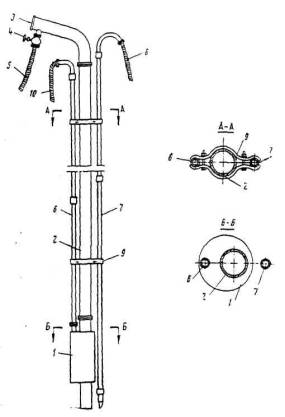 Рис. 29. Эрлифт с подмывной трубкой: 1 - эрлифт; 2 - стояк эрлифта; 3 - съемная заглушка; 4 - вентиль; 5 - шланг для промывки эрлифта; 6 - трубка для воздуха; 7 - подмывная трубка; 8 - шланг для подачи воды; 9 - хомут; 10 - шланг для подачи воздуха