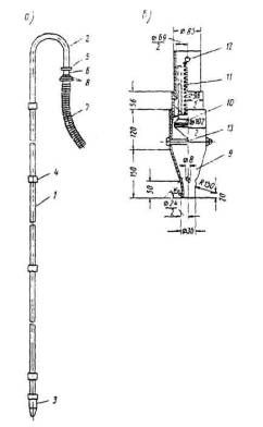 Рис. 30. Подмывная трубка: а - общий вид; б - конструкция наконечника; 1 - секция трубки; 2 - колено; 3 - наконечник; 4 - соединительная муфта; 5 - фланец; 6 - патрубок; 7 - резиновый шланг; 8 - хомуты; 9 - корпус наконечника; 10 - клапан; 11 - пружина; 12 - болт крепления пружины; 13 - ограничительный болт б) устанавливают опалубку и арматуру плиты; в) бетонируют плиту; г) устанавливают опалубку тела опоры и заменяют распорки ограждения; д) бетонируют тело опоры до отметки выше уровня воды: е) затопляют котлован; ж) разбирают ограждение. 5.10. Погружение оболочек следует выполнять комплексной бригадой, состоящей из 5 звеньев, из которых четыре звена выполняют сопутствующие работы и одно звено - свайные работы. Состав звеньев, квалификация и разряды рабочих уточняются на месте работ в зависимости от имеющегося оборудования и оснастки. Звено 1. Монтажники конструкций - 5-6 чел. Выполняет перестановку направляющих копров и ячеек, монтаж подмывной трубки, эрлифта и приспособлений для подводного бетонирования, сборку и разборку ограждения котлована. Звено 2. Команда, обслуживающая плавсредства, - 4-6 чел. Выполняет закладку якорей, установку якорниц, вывод плавучей системы и раскрепление ее на оси оболочки, регулирование положения плавучей системы в процессе работ. Звено 3. Копровщики, машинисты крана и вибропогружателя - 4-6 чел. Выполняет установку и погружение оболочек Звено 4. Машинист и слесари компрессорной и насосной - 3-5 чел. Выполняет обслуживание компрессора, насоса эрлифта, подмывной трубки и пневматических молотков. Звено 5. Бетонщики, арматурщики и плотники - 3-5 чел. Выполняет срубку фланцев, установку опалубки и арматуры, бетонирование полостей оболочек водозащитной подушки, ростверка и тела опоры. Кроме того, работы должны обслуживать дежурные электрик и слесарь. 5.11. Достигнутые передовиками производства затраты труда на вибропогружение оболочки, количество и квалификация рабочих приведены в табл. 6.