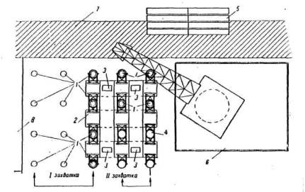 Рис. 31. Схема организации рабочего места по погружению оболочек при строительстве причалов эстакадного типа с помощью направляющего каркаса для температурной секции причала: 1 - погруженная оболочка; 2 - направляющий каркас; 3 - лебедки направляющего каркаса; 4 - ячейки направляющего каркаса; 5 - место складирования оболочек; 6 - плавкран грузоподъемностью 15 Т; 7 - тыловая часть причала; 8 - ранее сооруженная секция Работы на температурной секции ведут захватками, объединяющими: первая - три ряда оболочек, а остальные - по два; ряда (3+2+2+2 рядов). Грунт в котловане до проектной глубины разрабатывают экскаватором на всю температурную секцию. Экскаватор перемещается по берегу вдоль котлована. Направляющий каркас закрепляют в проектном положении (с помощью якорей и расчалок или жестких распорок за сооруженную секцию причала) и частично заливают понтоны водой. На оболочке закрепляют строповочное устройство, затем ее приподнимают и укладывают на специальную подкладку и надевают круговую площадку с лестницей. Оболочку поднимают и устанавливают в угловую ячейку направляющего каркаса на дно котлована и открепляют строповочное устройство. При установке и погружении двух первых угловых оболочек тщательно проверяют их положение в продольном и поперечном направлениях.
