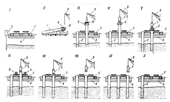 Рис. 32. Схема поточного вибропогружения оболочек: I - установка направляющего каркаса; II - укладка оболочки на подкладку и установка круговой площадки; III - опускание оболочки через ячейку направляющего каркаса; IV - установка и приболчивание вибропогружателя; V - частичное погружение оболочки; VI - снятие металлических подмостей; VII - окончательное погружение оболочки; VIII - снятие вибропогружателя; IX - операции I-VIII повторяются с каждой оболочкой в захватке; Х - вывод направляющего каркаса и установка на следующей захватке; 1 - погружаемая оболочка; 2 - погруженная оболочка; 3 - ранее сооруженная секция причала; 4 - направляющий каркас; 5 - ячейка направляющего каркаса; 6 - металлические сборно-расборные подмости; 7 - вибропогружатель; 8 - подкладка; 9 - стрела плавучего крана; 10 - траверса