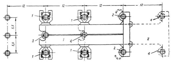 Рис. 35. Схема движения плавкондуктора по фронту работ: I - первое положение плавкондуктора; II - второе положение плавкондуктора; 1 - оболочки, за которые кропится плавкондуктор; 2 - первая и вторая погружаемые оболочки в носовой части при первом положении кондуктора; 3 - третья погружаемая свая в корневой части при первом положении кондуктора; 4 - погружаемые оболочки при втором положении кондуктора