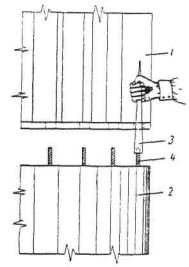 Рис. 36. Использование направляющей оправки при установке вибропогружателя на оболочку: 1 - наголовник вибропогружателя; 2 - оболочка; 3 - коническая оправка; 4 - нарезные выпуски арматуры оболочки