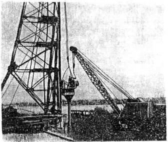 Рис. 37. Прикрепление вибропогружателя ВУ-1,6 с наголовником к оболочке с навесной площадкой Тремя коническими оправками через отверстия во фланце наголовника «ловят» выпуски рабочей арматуры оболочки, а затем наголовник с вибропогружателем опускают на ее торец. Для плотного прилегания наголовника и вибропогружателя к оболочке между фланцем наголовника и оболочкой ставят прокладку из прессованного войлока. Во время выполнения этой операции рабочие должны обращать особое внимание на хорошую затяжку гаек, так как при слабой затяжке резко снижается эффективность работы вибропогружателя. Перед окончательной затяжкой гаек и постановкой контргаек включают на 10-15 сек вибропогружатель. Соединение наголовника с оболочкой и подтяжку гаек рабочие выполняют с инвентарной площадки с перилами, подвешенной к вибропогружателю (рис. 37). Погружение оболочек ведут залогами, включая вибропогружатель на 3-15 мин. В перерывы между залогами, необходимые для остывания электродвигателя, осматривают состояние оболочки и крепление к ней вибропогружателя. Продолжительность залогов определяют в результате опытного погружения первых оболочек. Величину погружения от каждого залога замеряют с помощью геодезических инструментов и заносят в журнал. При снижении скорости заглубления оболочки до 3 см/мин. прекращают вибропогружение и начинают извлекать грунт из полости оболочки эрлифтом, опускаемым в оболочку в собранном виде плавучим краном грузоподъемностью 15 Т. Для предотвращения наплыва грунта из-под ножа в оболочку при работе эрлифта уровень воды в ней поддерживают выше горизонта воды в акватории. Грунт извлекают до отметки на 0,8-1 м выше ножа оболочки и после этого вытаскивают из нее эрлифт. Затем продолжают погружение оболочки до проектной отметки. Отвертывают гайки крепления вибропогружателя к оболочке, снимают вибропогружатель с наголовником и переносят на следующую оболочку. После перемещения плавучего кондуктора на следующую захватку разбивают головы погруженных оболочек отбойными молотками до проектной отметки и срезают фланец. Работы производят с плавучего инвентарного мостика, состоящего из двух полуколец, которые на плаву подводятся к оболочке и замыкаются вокруг нее. Для предохранения оболочек от больших отколов бетона и обеспечения точности срубки на оболочку надевают бандаж из полосовой стали толщиной 5-6 мм и высотой 100 мм.