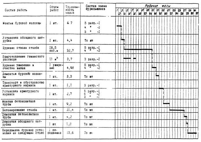 Рис. 41. Организация труда на устройство одного бурового столба диаметром 1,3 м с уширением до 2,4 м