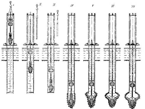 Рис. 42. Схема разбуривания уширения в основании оболочки: I - установка агрегата на оболочку; II - начало сборки буровой колонны; III - окончание сборки буровой колонны: IV - бурение скважины ниже ножа оболочки: V - бурение уширения до диаметра 3-м (I этап); VI - бурение уширения до полного диаметра 3,5 м (II этап); VII - бурение цилиндрической части уширения (III этап) Устранение мелких неисправностей производят дежурные механик и электрик, обслуживающие все строительство. 7.16. Фактические, достигнутые передовиками производства, затраты времени на разбуривание скважины ниже ножа оболочки на глубину 4,5 м приведены в табл. 8, а на разбуривание одного уширения диаметром 3,5 м - в табл. 9. Таблица 8