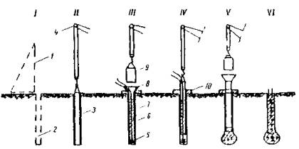 Рис. 43. Схема устройства камуфлетного уширения в основании буровой сваи: I - бурение скважины; II - установка обсадной трубы; III - опускание заряда ВВ, постановка воронки, укладка в скважину бетонной смеси литой конструкции; IV - приподнимание обсадной трубы, постановка удерживающего хомута; V - взрывание наряда и образование камуфлетного уширения; VI - поднятие обсадной трубы, постановка арматурных стержней, бетонирование ствола скважины; 1 - буровой агрегат; 2 - буровая скважина; 3 - обсадная труба; 4 - кран; 5 - заряд ВВ; 6 - электропровода; 7 - литая бетонная смесь; 8 - воронка; 9 - бадья; 10 - хомут б) специалист-подрывник подготовляет и вместе с бурильщиком 3 разр. опускают на дно скважины заряды взрывчатого вещества (ВВ), которые основной и дублирующей электросетями соединяют с подрывной машинкой. Заряды ВВ необходимо опускать на тросе или проволоке. Запрещается использование для этой цели проводов или трубок, защищающих электровзрывную цепь. Провода основной и дублирующей сети должны иметь хорошую гидроизоляцию; в) опущенный на дно скважины заряд ВВ присыпают слоем песка толщиной 10-15 см для предохранения от детонации при ударе падающей бетонной смеси в скважину; г) после установки заряда и проверки подрывником сохранности и общего сопротивления у всей электровзрывной цепи двое рабочих (бетонщик 4 разр. и бурильщик 3 разр.) и машинист крана подают бадью с бетонной смесью литой консистенции и заполняют скважину на высоту, предусмотренную проектом, с таким расчетом, чтобы после взрыва заряда ВВ и заполнения бетонной смесью камуфлетного уширения в оболочке оставался столб смеси высотой не менее 2 м; д) после подачи бетонной смеси в скважину подрывник подает сигнал, следит за удалением всех работающих из опасной зоны работ и производит взрыв для образования камуфлетного уширения; е) затем двое рабочих (бетонщик 4 разр. и бурильщик 3 разр.) и машинист крана производят укладку бетонной смеси в сваю. После окончания бетонирования трубу с вибробункером переносят на другую сваю. 8.7. При наличии в скважине грунтовой воды все процессы устройства уширения, кроме заполнения бетонолитной трубы бетоном (пп. «г», «д»), остаются без изменения. В этом случае после присыпки заряда ВВ песком производятся следующие операции: г) бетонщик и бурильщик 3 разр. устанавливают в месте соединения воронки и бетонолитной трубы пробку и подвешивают ее пеньковыми канатами за верхний край воронки; д) машинист крана заполняет воронку бетонной смесью литой консистенции. Объем воронки должен быть рассчитан с таким расчетом, чтобы после взрыва заряда ВВ и заполнения бетонной смесью камуфлетного уширения в бетонолитной трубе оставался столб бетона высотой не менее 1 м; е) бетонщик 3 разр., после заполнения воронки бетоном, перестроповывает пеньковые канаты, удерживающие пробку за самоотстрапливающийся гак крана; ж) после удаления всех работающих из опасной зоны по сигналу мастера производят расстроповку пробки и одновременный взрыв. Затем продолжается укладка бетонной смеси до полного заполнения сваи бетоном. Приложение 1ОСНОВНЫЕ ТРЕБОВАНИЯ ТЕХНИКИ БЕЗОПАСНОСТИ НА СВАЙНЫХ РАБОТАХ1. К работам по погружению сваи, оболочек и шпунта, а также устройству буровых свай допускаются лица, сдавшие техническим минимум, знающие правила обращения с оборудованием и прошедшие инструктаж п