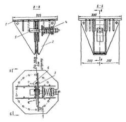 Рис. 1. Наголовник для стального шпунта: 1 - плита; 2 - ребро жесткости; 3 - направляющая; 4 - пружина; 5 - палец клиновидный; 6 - шпунтина типа «Ларсен V» Наголовник состоит из плиты толщиной 40 мм, направляющих с улавливающими скосами (ребер жесткости) и клиновидного пальца с затяжной пружиной и ганками. Плита соединена с направляющими и ребрами жесткости через пальцы, приклепанные к плите. Наголовник болтами кренят к нижней плите вибропогружателя. В голове шпунтины по оси на расстоянии 1500 мм от торца вырезают отверстие размером 120×60 мм. Вибропогружатель вместе с наголовником устанавливают на шпунтину. Отверстие в шпунтине совмещают с гнездом в наголовнике, вставляют клин в отверстие, надевают пружину и затягивают гайки. При вибропогружении клин под действием пружины все глубже входит и отверстие, обеспечивая жесткое соединение шпунтины с наголовником. 2. Сварной вильчатый наголовник (рис. 2) для набивки плоского железобетонного шпунта.