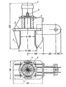 Рис. 2. Наголовник для железобетонного шпунта: 1 - вилка; 2 - диафрагма; 3 - стакан; 4 - подъемная петля; 5 - деревянная пробка Наголовник состоят из вилки с улавливающими скосами и ребрами жесткости, распределяющей плиты-диафрагмы, стакана-обоймы для деревянного амортизирующего вкладыша и хвостовика, входящего в направляющие стрелы копра. Вес наголовника - 465 кг. В тяжелые грунты шпунтины погружают по одной. Вильчатый наголовник через дощатую прокладку передает удар на центральную часть торца шпунтины. Таким образом, уменьшается вероятность более слабых частей профиля шпунтины - гребня и стенки паза. В легкие грунты вильчатый наголовник позволяет погружать шпуптины попарно с помощью бруса, заложенного в вилку и распределяющего удар на торцы обеих шпуптин. По мере измочаливания дощатая прокладка или брус заменяются новыми. 3. Автоматический наголовник типа АСН -40 (рис. 3) для погружения призматических железобетонных свай вибропогружателем с возмущающей силой 15-30 Т.