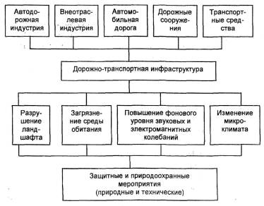 Рис. 1.1. Схема взаимодействия дорожно-транспортной инфраструктуры с окружающей средой Автомобильная дорога как инженерное сооружение нарушает природные ландшафты, изменяет режим стока поверхностных и грунтовых вод. При пересечении речных долин на подходах к искусственным сооружениям нарушается средняя скорость преобладающих ветров, что приводит к изменению микроклимата и взаимосвязанных с ним явлений во флоре и фауне. Дорога может нарушить традиционные сезонные пути миграции животных и насекомых. Стремление дорожников к снижению затрат за счет применения в строительстве конструктивных слоев из местных некондиционных материалов и отходов промышленного производства не всегда оправдано, так как пиритовые огарки, ртутьсодержащие отходы, каменноугольные дегти, смолы и пески, кумароновые смолы, радиоактивные породы, разнообразные шламы цветной металлургии способны загрязнять придорожную полосу токсичными веществами. Например, Б.М. Лебедев в своих исследованиях приводит факты использования фенольной смолы в качестве вяжущего в основании дорожной одежды в Пермской области, которая вызвала интенсивное загрязнение далеко за пределами дороги. При проектировании обхода г. Брянска специалистами Воронежского ГипродорНИИ не были учтены последствия гравитационного воздействия насыпи на грунтовые воды, в результате чего при строительстве дороги несколько гектаров строевого леса было подтоплено и деревья погибли. С момента ввода дороги в эксплуатацию происходит миграция химических веществ из дорожных вяжущих материалов: 1) перемещением частиц и их перемешиванием в приземных слоях воздуха в результате износа и механического повреждения дорожных покрытий; 2) диффузией с поверхности полотна дороги. Известно токсическое свойство каменноугольных смол, которые при контакте с кожным покровом человека вызывают поражение фолликулярного аппарата, фотодерматиты, а также, проникая через кожу, - патологические изменения печени, почек, селезенки. Явления кожно-резорбтивного действия этих смол могут проявляться не только при непосредственном контакте с ними, но и путем резорбации их паров через кожу из воздуха [71]. Длительное вдыхание цементной пыли с большим содержанием диоксида кремния ведет к развитию фиброзного процесса в легких. В продуктах пиролиза каменного угля содержится бенз(а)пирен, который может поступать в атмосферный воздух придорожной полосы с дорожной пылью. Он образуется в результате износа дорожного покрытия [42], однако методики определения его в зоне влияния автомобильных дорог еще не создано. Продукты износа покрышек, тормозных накладок автомобилей и покрытия автомобильной дороги, просыпанная и раздробленная колесами часть перевозимых по дороге грузов, противогололедные материалы турбулентным потоком воздуха распыляются в атмосферу, системой водоотводных сооружений переносятся в водоемы с аккумуляцией их в донном иле и последующим отравлением живых организмов. Кроме того, при сложившейся инфраструктуре, характере расселения людей прокладка новой дороги вносит порой довольно значительные социальные изменения, положительные для пользователей транспортом и отрицательные для населения мест, через которые проходит транзитное движение. Уже сегодня строительство новых дорог вызывает обоснован
