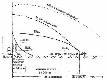 Но что же делать на существующих старых дорогах с застройкой чуть ли не у полосы отвода? Конечно, такие места непригодны для магистральных и скоростных дорог. Для них нужны обходы городов и других поселений. А если уж нельзя вынести транзитное (особенно грузовое) движение, то приходится строить защитные сооружения: специальные валы, ограждения, размещать проезжую часть в выемке. Недавно СоюздорНИИ выпущен альбом типовых конструкций таких сооружений с указаниями по их расчету. Защитные ограждения более 30 разновидностей разного назначения и стоимости обеспечат широкий выбор для архитекторов [3]. В массовом сознании редко вызывает активный протест влияние на окружающую среду самой дороги как инженерного сооружения. Однако эта группа воздействий особенно опасна своими последствиями. Изъятие земель, разделение угодий, создание преград на сложившихся веками путях диких животных, да и нарушение привычных связей местных жителей... Меняются система поверхностного стока, уровень грунтовых вод, а значит, и условия жизни растений, мелкой фауны. Известно, что на прилегающих к дороге землях уже не может существовать природная биосистема, меняется состав растений и мелкой фауны. Основной закон экологии гласит: в природе все связано со всем. Потяни одну ниточку - и рассыпается вся система [4].