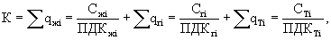 где qжi, qri и qтi - соответственно удельные массы i-гo токсичного компонента в жидких, газообразных и твердых отходах продукта, т/т; Сжi, Сri и Стi - соответственно концентрации i-гo компонента в жидких, твердых и газообразных отходах, мг/м3; ПДКжi, ПДКri и ПДКтi - соответственно предельно допустимые концентрации i-гo компонента в воде рыбохозяйственных водоемов, воздухе населенных мест и твердых отходах, мг/м3. Для оценки токсичности твердых отходов предложено использовать ПДКж, так как при хранении этих отходов происходит их растворение в атмосферных осадках, сточных и грунтовых водах. Удельная масса i-гo компонента в жидких отходах единичного источника определяется как qжi =