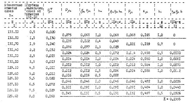 Примечание. В случае, если ljн(b) меньше соответственно 4 d и d, то принимаются интервалы, равные 4 d и d. 2. Определение средних значений удельных сопротивлений i-х участков грунта на боковой поверхности зонда Рfi и сваи (Kfi·Pfi·hi). Расчет сводим в таблицу (см. табл. 2). Расчетная схема приведена на рис. 1б. Графы 1÷3, 6, 10 табл. 2 заполняются на основании данных графика статического зондирования (см. рис. 1a), В графе 1 приведены значения абсолютных отметок слоев hк, м. Отметке 133.10 соответствует отметка уровня поверхности грунта. Последующие отметки выполняются в зависимости от принятых значений hк В графе 2 приведены значения глубины залегания слоев hк от отметки уровня поверхности грунта 133.10. В графе 6 приведены значения толщин к-х слоев грунта hк, м, границы которых устанавливаем в соответствии с п. 3.5. Производим проверку в местах наибольшего отклонения графика изменения Рfк от прямой (см. рис. 1г). В графе 10 приведены значения толщин i-х участков грунте hi, м, границы которых устанавливаем в соответствии с п. 3.6. Горизонтальные линии в таблице проведены через 1,0 м от уровня поверхности грунта плюс 0,5 м в соответствии с п. 3.6. Вторая линия сверху проведена для того, чтобы разделить слои песка мелкого и супеси, так как зондирование в нашем случае произведено установкой С-852 в режиме без стабилизации и имеет место случай изложенный в п. 3.8 (отрицательное трение). В графе 3 приведены значения удельных сопротивлений грунта на боковой поверхности зонда на границах к-х слоев Pfкгр, МПа. Графы 4, 5 и 7 служат для расчета числителя формулы 5 п. 3.7. В графу 4 вносим средние значения удельных сопротивлений грунта на боковой поверхности зонда к-х слоев Pfк, МПа, равное полусумме значений Pfкгр. В графу 5 вносим результат произведения данных графы 4 на коэффициент, приведенный в табл. 3. для песков мелких βfi = 0,9, для супесей βfi = 1,0 при зондировании установкой С-832 в режиме без стабилизации. В графу 7 вносим результат произведения граф 5 и 6, т.е. слагаемые числителя формулы 5 п. 3.7. В графу 8 вносим результат частного от деления суммы графы 7 между соответствующими горизонталями (числитель формулы 5 п. 3.7) на сумму графы 6 между соответствующими горизонталями, (знаменатель формулы 5 п. 3.7), т.е. среднее значение удельного сопротивления i-х участков грунта на боковой поверхности зонда, МПа. Графы 9 и 11 служат для расчета средних значений удельных сопротивлений i -х участков грунта на боковой поверхности сваи (Kfi·Pfi·hi). В графу 9 вносим значения коэффициента Kfi, принимаемые по значениям графы 8 по табл. 2 или по графикам приложения 4. В графу 10 вносим значения произведений граф 8, 9, 10, т.е. средние значения удельных сопротивлений i -х участков грунта на боковой поверхности сваи (Kfi·Pfi·hi). Вместо первых двух значений записаны "0", так как имеет место случай п. 3.8 (отрицательное трение) при h не более 2 м. В данном случае h = 2,2 - 0,5 = 1,7 м. Определяем сумму
