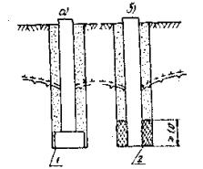Рис. 3. Одиночные стойки (сваи-столбы): а - сборное анкерное утирание; б - монолитное анкерное уширение; 1 - сварное утирание; 2 - цементно-песчаный раствор сваи-столбы постоянного сечения (сплошные или полые) - с заделкой в скальные грунты в случае их залегания не глубже 6-7 м (рис. 4); те же сваи-столбы - в вечномерзлых грунтах, используемых по принципу I; трубы со звеньями, заанкеренными в фундаментах; фундаменты труб с анкерной плитой (выступами), глубина заложения которых назначаемся согласно п.п. 4.1. и 4.2 (рис. 5); трубы, у которых звенья имеют наклон боковых наружных граней к продольной оси трубы.