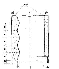 Рис. 6. Сваи-столбы: а - с "рифленым" нижним концом; б - с выступом на конце; 1 - раствор заделки; 2 - железобетонным выступ 5. ПРОТИВОПУЧИННЫЕ МЕРОПРИЯТИЯ5.1. Целесообразность применения постоянных противопучинных мероприятий устанавливается в каждом конкретном случае на основе технико-экономического расчета. 5.2. В качестве постоянных могут применяться следующие мероприятия; а) для свай-столбов и фундаментов с анкерной плитой в пределах слоя сезонного промерзания-оттаивания - заполнение пространства между этими фундаментами и стенками скважин или котлованов несмерзающейся смесью дренирующего грунта с солидолом1 или циатимом (с обязательным полным заполнением пор грунта данным составом), а также естественными гидрофобными материалами, например, заталькованными глинами. ____________________ Авт. свид. № 581188 «Противопучинная смесь» приоритет от 24 марта 1976 г. (авторы: Соболев Г.И., Опарин А.А.) Примечание. В данном случае обязательно применение мер, исключающих возможность размыва русла у опор; б) в вечномерзлых грунтах при принципе I их использования - совмещение со сваями или сваями-столбами самоохлаждающихся систем типа термосвай Гапеева, Макарова и т.д., что позволяет в зоне анкеровки понизить температуру; эта температура определяется специальным теплотехническим расчетом; в) на участках мостовых переходов, где наиболее вероятно возникновение линзовидного льда, следует предусматривать специальные мероприятия, изложенные в приложении 1. 5.3. В качестве постоянных противопучинных мероприятий в опытном строительстве капитальных мостов и труб и массовом строительстве временных искусственных сооружений, а также для временного предотвращения выпучивания фундаментов в период стабилизации температурного режима основания, если эта стабилизация завершается за период более одного зимнего сезона, рекомендуется: а) покрывать боковую поверхность фундаментов в пределах слоя сезонного промерзания-оттаивания полиэтиленовыми пленками (см. приложение 2), смазками БАМ или кремнийорганическими соединениями (см. приложение 3); б) утеплять поверхности грунта вокруг фундаментов синтетическими материалами с замкнутой ячеистой структурой (см. приложение 4). 5.4. На один зимний сезон в период незавершенного строительства мостов и труб и стабилизации температурного состояния вечномерзлых оснований (принцип I) с целью предотвращении выпучивания их фундаментов рекомендуется: а) покрывать боковую поверхность фундаментов в пределах слоя сезонного промерзания-оттаивания битумной мастикой, солидолом, циатимом и т.п.; б) защищать грунт вокруг фундаментов от промерзания мхом, торфом, шлаком, опилками и т.д. с предохранением их от увлажнения. 5.5. Не рекомендуется в качестве противопучинных мероприятий устраивать вокруг фундаментов замену пучинистого грунта или производить обработку засыпку котлована непучинистым грунтом. Приложение 1УЧЕТ ВЛИЯНИЯ ЛИНЗОВИДНОГО ЛЬДА НА МОРОЗНОЕ ВЫПУЧИВАНИЕ ФУНДАМЕНТОВ МОСТОВ И ТРУБПри изысканиях и проектировании переходов через малые и средние водотоки в Центральных районах Восточной Сибири, в частности, пересекаемых линией БАМ, фундаменты постовых опор и оголовков водопропускных труб могут деформироваться не только под влиянием морозного пучения грунтов, но и под воздействием линзовидного льда, развивающегося в соче