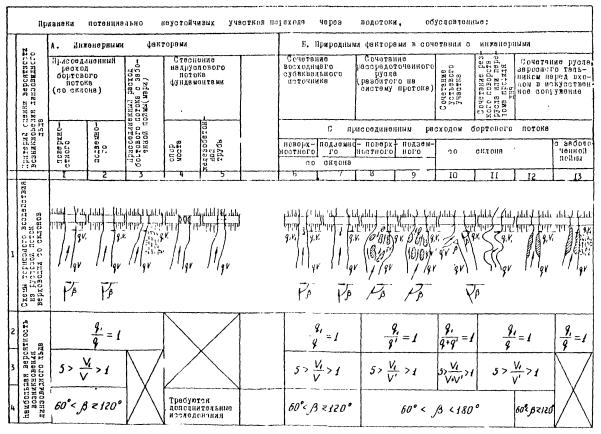 Схема тормозного воздействия на русловой поток инженерных факторов и их сочетаний с природными факторами. Поскольку склоновый поток (верховодка) почти всегда воздействует на русловой поток под углом β = 90°, он уже в силу этого аффекта может при соответствующих условиях погасить до 50% кинетической энергии руслового потока. Такие условия имеют место: при сближении величины расхода руслового (q1) и склонового(q) потоков, т.е. q1/q → 1, что наблюдается при малых потерях расхода q1, (значительная обводненность склонов осенними дождями, выпавшими в районе перехода, значительные снежные отложения на склонах в начале зимы, особенно при кустарниковом и травяном покрове и т.п.) и, наоборот, при больших потерях расхода q (сухая осень и не значительный снежный покров в верховьях бассейна, потери руслового потока на наледеобразование на участках русла, расположенных выше перехода и т.п.). Рассмотренные условия подлежат учету в следующих случаях, возможных как при крутых склонах узких логов, так и при поступлении воды в русло с замаренных (заболоченных) наклонных пойм, особенно, когда русло стеснено валунами или тальником, снижающими скорость потока: при скорости склонового потока V1 превышающей скорость руслового потока V, что имеет место при значительной разности отметок водоразделов по сравнению с отметкой дна лога или долины; при, наличии в русле водотока, в месте присоединения потока верховодки: субаквального источника, каменистого переката, скального выступа, отдельных валунов и островков, разбивающих русло на систему узких потоков с малыми глубинами. Поскольку склоновый поток в этих случаях взаимодействует не с русловым потоком, а с протокой, имеющей расход q1 < q, вероятность возникновения линзовидного льда сильно возрастает; в этих условиях он может появиться даже при значительной ширине русла - на средних горных реках; при наличии в месте проектируемого перехода соединения двух и более поверхностных ручьев, особенно при угле 60-90°; при наличии в русле мелких островков, сложенных водоносными грунтами, разбивающих его на ряд проток, а также валунов и других препятствий, снижающих скорость и способствующих возникновению в промерзающих наносах двух и более грунтовых потоков, взаимодействующих под большим углом; при стеснении фундаментами трубы или моста подруслового потока, особенно в сочетании с его ускоренным промерзанием в пределах сооружения. Во всех этих случаях, возникновение линзовидного льда в русле возможно лишь при наличии подруслового потока и промерзания русла до твердого основания. Качественный прогноз возникновения линзовидного льда при выборе места перехода невозможен без строгого соблюдения правил строительства и эксплуатации земляного полотна водопропускных сооружений. Намеченные при изысканиях трассы в качестве мест перехода участки русла водотоков (конкурирующие варианты), с точки зрения прогнозируемого развития линзовидного льда делятся на следующие группы: устойчивые, где линзовидный лед не обнаружен ни в русле (визуально или по опросным данным), ни в грунте (буровыми скважинами) и по данным прогноза отсутствует возможность его появления по окончании строительства; неустойчивые, где линзовидный лед обнаружен в виде бугров в русле (визуально или по данным опроса старожилов) или в грунте (буровыми скважи