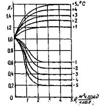 Рис. Номограмма для определения коэффициента КТ при расчете конечных глубин промерзания и оттаивания теплоизоляционного грунта (по Ю.С. Палькину); цифры на кривых - температура грунта на глубине годовых нулевых амплитуд δR - толщина слоя теплоизоляции, уложенной заподлицо (с выемкой грунта) с уровней поверхности грунта. Термическое сопротивление R представляет собой отношение толщины слоя теплоизоляции δR к значению коэффициента теплопроводности λт материала теплоизоляции