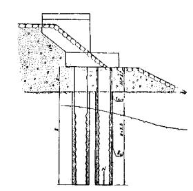 m3 - коэффициент условий работы на срез раствора заделки, принимаемый равным 0,06; R΄сж - кубиковая прочность бетона заделки, т/м2; Кг - коэффициент безопасности, принимаемый равный 1,5; и΄ - периметр сечения столба в зоне заделки; h3 - расчетная глубина заделки столбов определяется как полная глубина заделки за вычетом высоты выступов, совпадающих с общей поверхностью сдвига. 3.10. Пример расчета сваи-столба на действие касательных сил пучения приведен в приложении 5. 4. ОСНОВНЫЕ ТРЕБОВАНИЯ К КОНСТРУИРОВАНИЮ ФУНдАМЕНТОВ МОСТОВ И ТРУБ С УЧЕТОМ ПУЧЕНИЯ ГРУНТОВ ИХ ОСНОВАНИЯ.4.1. Если слой сезонного промерзания-оттаивания в естественном состоянии состоит из крупных и среднезернистых песков или крупнообломочных грунтов с содержанием пылеватого или глинистого заполнителя менее 10% и отсутствует вероятность образования линзовидного льда, подошву фундаментов мелкого заложения или низ свайного ростверка разрешается закладывать на любой глубине независимо от расчетной глубины сезонного промерзания-оттаивания. Подошву фундаментов мелкого заложения с анкерной плитой, а также подошву фундаментной части труб разрешается закладывать также на любой глубине, в том числе и в слое сезонного промерзания-оттаивания, если этот слой состоит из указанного выше грунта или из крупнообломочного грунта с содержанием пылеватого или глинистого заполнителя до 30%. 4.2. В остальных случаях (т.е. в пучинистых грунтах) с целью исключения нормальных сил пучения необходимо: а) подошву фундаментов мелкого заложения закладывать не менее чем на 0,5 м, а низ находящейся в грунте плиты (ростверка) свайного фундамента - не менее чем на 0,25 м ниже расчетной глубины сезонного промерзания-оттаивания; б) низ плиты (ростверка) свайного фундамента, возвышающейся над планировочной поверхностью площадки мостового перехода, размещать выше этой поверхности на 0,5 м для устоев и на 1 м для промежуточных опор; в) с учетом возможного повышения уровня этой поверхности (отсыпка, каменная наброска, мощение, намыв грунта) между плитой ростверка и поверхностью грунта должен быть обеспечен зазор высотой 0,15-0,2 м, сохраняемый в течение всего срока эксплуатации моста; с этой целью внизу плиты ростверка в обсыпных устоях рекомендуется устраивать ограждающие бортики, предохраняющие от попадания грунта под плиту: г) устои мостов и звенья труб следует обсыпать дренирующим грунтом. 4.3. Требования п. 4.2. необходимо соблюдать и в случаях замены у фундамента (ростверке) пучинистых грунтов на непучинистые, и также при наличии напорных вод в слое сезонного промерзания-оттаивания (см. приложение 1). Расчет фундаментов на выпучивание при этом является обязательным при любых видах грунтов. 4.4. Продольная арматура фундаментов на расчетной глубине сезонного промерзания-оттаивания должна проверяться на растягивающее усилие Рр по формуле Рр=τвып.F-N (16) где обозначения те же, что в формуле (5). 4.5. Для повышения эффективности работы на выпучивание фундаментов мостов и конструкций труб рекомендуется следующее: при проектировании типовых проектов назначать расчетную схему с меньшим числом промежуточных опор (для увеличения постоянной нагрузки на опору); при разработке новых проектов стремиться к применению опор из свай, свай-столбов или стоек повышенной несущей способности при наименьшем их количестве, определя
