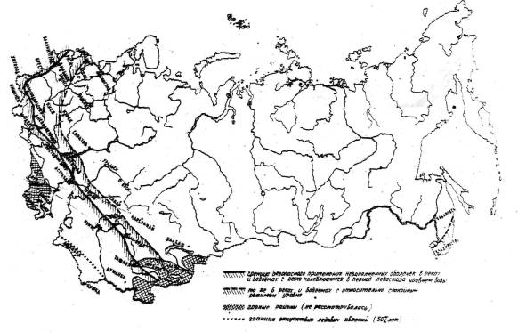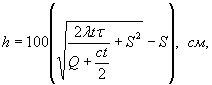 Примечания: * При сравнении толщины ледяной пробки с толщиной ледяного покрова реки предлагается набольшее значение последней (при отсутствии снежного покрова). ** Изменение уровня воды считается скачкообразным, если оно происходит со скоростью, превышающей 1,5 см/сут. II. МЕТОДИКА РАСЧЕТА4. Методикой расчета предусматривается: а) определение расчетной толщины ледяной пробки; б) определение расчетной температуры ледяной пробки; в) определение расчетного давления льда на оболочку; г) определение напряжений в оболочке; д) оценка трещиностойкости оболочки; 5. Предполагаемая толщина ледяной пробки и положение ее во внутренней полости оболочки определяются приближенно. Зная расположение оболочки на местности и общий характер изменения уровня воды в реке в период ледостава, можно по рис. 2 установить ожидаемое льдообразование в оболочке, а затем определись предполагаемую толщину ледяной пробки h по формуле: где λ = 2,0 - коэффициент теплопроводности льда, ккал/м. час. град; t - температура воздуха над поверхностью льда, град; τ - расчетное время льдообразования, час; Q = 73600 - скрытая теплота льдообразования, ккал/м3; с = 460 - объемная теплоемкость льда, ккал/м3. град; S - толщина эквивалентного слоя льда, термическое сопротивление которого равно сопротивлению теплоотдаче с поверхности, м. Температура воздуха над поверхностью льда (t) численно равна средней зимней температуре. Последняя определяется по табл. I СНиП II-А.6-62 [5]. Толщина эквивалентного слоя S принимается по формуле