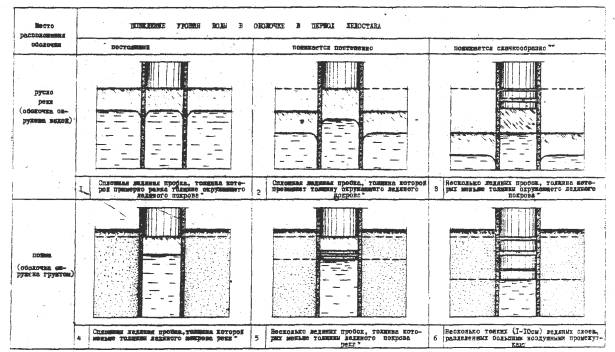 Рис. 1. 2. При расположении опоры на пойме где лед в оболочке образуется ниже поверхности окружающего оболочку грунта (типы 4, 5, 6 на рис. 2), или при установке оболочки в водоеме, уровень воды в котором в период ледостава не изменяется (тип. I на рис. 2) давление льда незначительно, и поэтому при расчете может не учитываться. 3. Расчетное давление ледяной пробки при ее температурном расширении возникает в результате мгновенного затопления ледяной пробки и оболочки водой при условии, что перед этим уровень воды в реке понижался (типы 2 и 3 на рис. 2), и затоплению предшествовало медленное длительное похолодание, в ходе которого бетон и лед остыли до температуры, близкой к температуре наружного воздуха, а напряжения и трещины в ледяной пробке и на контакте ее с оболочкой не возникли. Характерные типы льдообразования в оболочках.