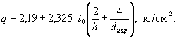 Примечание: dвн - внутренний диаметр оболочки, см. 10. Для повышения трещиностойкости оболочек, подвергающихся давлению ледяных пробок, рекомендуются следующие мероприятия: увеличение толщины стенок, применение оболочек более крупного диаметра, повышение предельно допустимого растягивающего напряжения в бетоне оболочек и применение напряженной спиральной арматуры. Эффективность каждого из этих мероприятий может быть проверена с помощью изложенной методики. III. ПРИМЕР РАСЧЕТАПусть требуется проверить и сравнить трещиностойкость полых оболочек диаметром 60 см, которые предполагается установить в русле реки Оби в районе города Сургута. Режим уровня реки в период ледостава в течение всего срока службы моста относительно спокойный (река не зарегулирована - волны попуска ближайшей ГЭС на Оби не доходят до моста). Из этого следует, что нижняя поверхность ледяной пробки всегда будет соприкасаться с водой. На реке возможны заторы и подъем уровня, в результате которых предварительно остывшая ледяная пробка может внезапно затопляться водой, т.е. возможно возникновение давления на оболочку. а) Ожидаемое льдообразование в данных условиях может быть отнесено к типу 2 (рис. 2). Наибольшая толщина ледяной пробки h ориентировочно по формуле (I) равна 110 см. б) По табл. 1 интерполяцией находим, что время τo , необходимое для остывания ледяной пробки толщиной 110 см в оболочке диаметром 60 см до температуры, близкой к температуре окружающего воздуха, равно 0,76 суток. Наиболее низкую среднюю температуру воздуха за такой период в районе Сургута находим интерполяцией между абсолютным минимумом и температурой самых холодных суток по табл. I СНиП II-А 6-62 [5]. Итак, расчетная начальная температура ледяной пробки tо = -47º. в) По формуле (2) находим