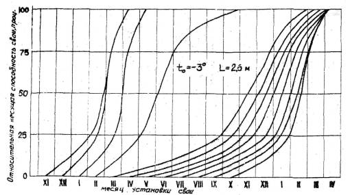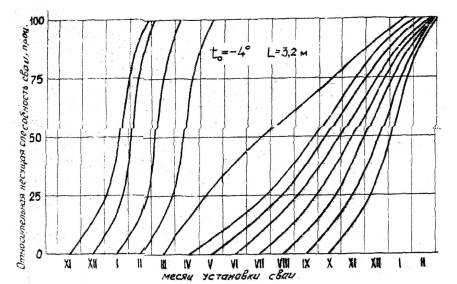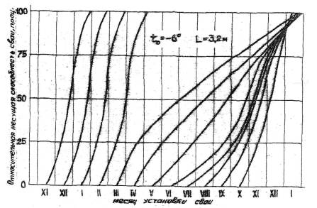научно-исследовательский институт РУКОВОДСТВО Красноярск 1977«Руководство по определению сроков загружения свайных фундаментов при строительстве на вечномерзлых грунтах по принципу I» составлено в развитие главы СНиП по проектированию оснований и фундаментов на вечномерзлых грунтах. В Руководстве использованы результаты теоретических и экспериментальных исследований Института "Красноярский промстройниипроект" и его филиала в Якутске, а также отдельный материалы ряда других организаций. Работа выполнена институтов «Красноярский промстройниипроект» Руководство составили кандидаты технических наук Ш.Ф. Акбулатов, Ю.Е. Гавриш (руководитель работы), Ю.М. Гончаров, Н.С. Хворостовская (отв. исполнитель), инженеры В.И. Егоров, В.Л. Полещук. В подборе, систематизации и обработка материалов, использованных в руководстве, участвовали инженеры В.Л. пичугина, А.И. Тамарина и В.А. Щеголихина. Руководство рассмотрено и одобрено секцией "Строительство в районах Севера" научно-технического совета Главкрасноярскстроя. Руководство рассчитано на работников отделов и групп ПОР проектных организации и инженерно-технических работников строительных организаций. 1. Настоящее Руководство предназначено для использования при разработке проектов производства работ и определения сроков и темпов возможного загружения свай на строительной площадке при устройстве свайных фундаментов на вечномерзлых грунтах с сохранением их мерзлого состояния. Руководство рассчитано для применения в Якутске и прилегающих к нему районах, но может быть использовано и для районов со сходными природно-климатическими и мерзлотно-грунтовыми условиями. 2. Сроки загружения, определенные Руководством, должны уточняться в процессе строительства по данным наблюдений, проводимым в соответствии с действующими требованиями, за фактическим изменением температуры грунта в рабочей зоне свай. 3. Руководство применимо для строительных площадок с песчаными и глинистыми вечномерзлыми грунтами с температурой на глубине 10,00 м от поверхности не выше минус 2,0°С при способе погружения свай в пробуренные скважины и не выше минус 3,0°С - при способе погружения свай в оттаянный паром грунт. 4. Положения Руководства рассчитаны на следующие условия: размеры поперечного сечения свай призматических - не более 0,40×0,40 м, свай круглого сечения - диаметр не более 0,45 м; диаметр пробуренной скважины - не более 0,65 м или диаметр оттаянной парой зоны в момент окончания парооттайки - не более 0,90 м; расстояние L между осями смежных свай в фундаменте - не менее 2,50 м (при этом учтено уменьшенное расстояние между сваями в местах расположения деформативных швов). 5. Исходными данными для определения сроков загружения свай в настоящем Руководстве являются: а) способ погружения свай в вечномерзлое основание; б) месяц установки свай; в) расстояние L между осями смежных свай в ряду, м; г) температура to вечномерзлого грунта на глубине 10,00 м в естественны условиях, °С. 6. Для засоленного грунта в рабочей зоне свай в качестве исходной температуры следует принимать температуру на глубине 10,00 м в естественных условиях tСo с поправкой на температуру начала замерзания tСф засоленного грунта в рабочей зоне сваи to=tco-tcф Температуру начала замерзания tСф следует назначать по данным изысканий. 7. Определение сроков возможног