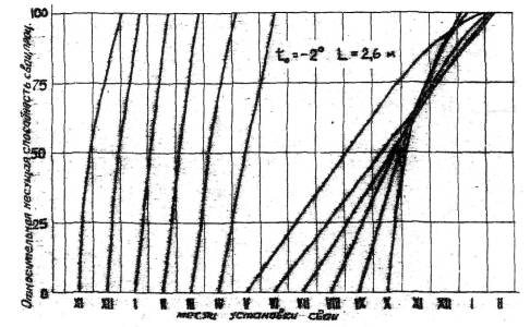 Рис. 6. график для определения роста несущей способности сваи, погруженной в оттаянный паром грунт.