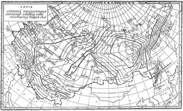 Ординаты выражают деформации в мм/м Рис. 2 Из табл. 1 и рис. 2 видно, что величина максимальных растягивающих термоупругих деформаций в поверхностном слое бетонных опор равна 0,096 мм/м, т. е. оказалась меньше допускаемой величины равной 0,1 мм/м, следовательно, в опоре отсутствует опасность появления трещин. Приложение IIМЕТОДИКА ОПРЕДЕЛЕНИЯ КРИВОЙ НЕВЫГОДНЕЙШЕГО РАСПРЕДЕЛЕНИЯ ТЕМПЕРАТУР ПО ТОЛЩИНЕ БЕТОННЫХ ОПОРДля расчета максимальных термоупругих деформаций растяжения в бетонной кладке (приложение I) необходимо знать невыгоднейшее распределение температуры в теле опоры, возможное при климатических условиях, имеющих место в районе расположения рассматриваемого моста. Климатические условия характеризуются (рис. 3) двумя величинами: максимальной амплитудой годового хода среднемесячных температур (Аг) и максимальной ординатой, возможного декадного отклонения от годового хода среднесуточных температур (Ад). При этом положение декадного отклонения принято совпадающим по времени с наиболее неравномерным распределением температур в массиве от изменения среднемесячных температур воздуха. Для определения величин Аг и Ад составлены карты территории СССР с изолиниями (рис. 4 и 5).