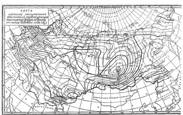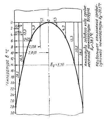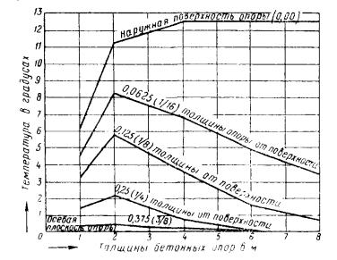 где λд - значение коэффициента теплопроводности для данного бетона. Пример. Построить невыгоднейшую кривую распределения температур в кладке бетонной опоры толщиной 5,7 м. По карте изолиний (см. рис. 4 и 5) в районе, в котором построена опора, амплитуда годового хода температуры воздуха Аг равна 38,1º; наибольшие за декаду отклонения среднесуточной температуры воздуха от линии годового хода Ад = 20,5°. Теплопроводность бетона равна 1,7 ккал/м град. час.