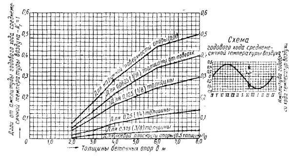 Рис. 8 Из графиков (см. рис. 6 и 7) находим ординаты кривых распределения температуры под влиянием годового хода и декадных отклонений температуры воздуха. Поскольку графики для определения ординат невыгоднейшего распределения температуры были составлены при коэффициенте теплопроводности бетона 1,1 ккал/м град, час, то расчетная толщина вф опоры при пользовании графиками определяется по формуле