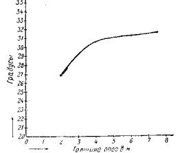 Пример 3. Максимальные растягивающие термоупругие деформации в бетонной опоре равны 0,48 мм/м, т.е. оказались больше предельных на 0,38 мм/м. В случае снижения растягивающих деформаций за счет регулирования температурного режима бетон, идущий в ядро опоры, необходимо нагреть на 0,38:0,007 1=54°. Пусть бетон и вода имеют те же характеристики, что и в примере 2, тогда бетон в ядре должен иметь температуру 14°+54°=68°, что больше допустимой величины нагрева бетона, равной 40°; такой нагрев бетона не может быть разрешен. Вследствие этого, для предупреждения образования температурных трещин необходимо применить другие, из рекомендуемых в настоящих Технических указаниях, мероприятия. Приложение VIОПРЕДЕЛЕНИЕ ДОПУСТИМОЙ РАЗНОСТИ ТЕМПЕРАТУР БЕТОНА В ЦЕНТРЕ ОПОРЫ И НАРУЖНОГО ВОЗДУХА ПРИ РАСПАЛУБКЕДопустимая при распалубке разность температур бетона в центре опоры и наружного воздуха tдoп определяется по графику (рис. 14) в зависимости от толщины опоры. При составлении графика распределение температур в поперечном сечении опор принималось параболическим.