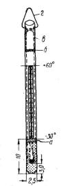 Рис. 14 Для опор, бетонируемых с регулированием температурного режима (приложение IV), значение tдoп дополнительно увеличивается на 2/3 величины подогрева бетона в ядре. Пример. Опора толщиной 6,0 м возводилась с регулированием температурного режима бетона с разностью температур бетона в ядре и на периферии равной 15°. Для опоры толщиной 6,0 м (без учета подогрева бетона в ядре) по графику (см. рис. 14) допустимая при распалубке разность температур между центром опоры и наружным воздухом tдoп равна 31,3°. Вследствие того, что опора возводилась с регулированием температурного режима бетона в процессе его укладки, tдoп должно быть увеличено на 2/3 15=10°. Ввиду этого окончательно tдoп =31,3+10=41,3°. Таким образом опору можно распалубливать, не опасаясь появления в ней температурных трещин, если разность температур в центре опоры и наружного воздуха будет меньше или равна 41,3°. Приложение VIIМЕТОДИКА ИЗМЕРЕНИЯ ТЕМПЕРАТУР В БЕТОННЫХ ОПОРАХ МОСТОВ ПРИ ПОМОЩИ РТУТНЫХ ТЕРМОМЕТРОВ1. Для измерения температур в бетонных опорах мостов ртутными термометрами должны устраиваться скважины диаметром 4 см. Во избежание скапливания воды, скважины должны иметь уклон к наружной поверхности не менее 0,01. Скважины должны располагаться в середине опоры, ниже верха опоры и выше обреза фундамента не менее чем на 2 м. 2. Скважины для измерения температур необходимо устраивать при бетонировании опор. С этой целью следует заранее заготовить металлические трубы диаметром 1,5 дюйма с поперечными рукоятями длиной 40 см. Длина каждой трубы должна быть равна глубине скважины плюс запас 25 см на удобное проворачивание трубы. Полый конец труб должен быть заделан цементным раствором вровень с краями трубы. Во избежание схватывания с бетоном, трубы должны систематически проворачиваться через каждые 20-25 минут (начиная с момента забетонирования труб) в продолжении одних суток, после чего трубы могут быть удалены. При этом проворачивание труб должно быть обязательно круговым и, кроме того, дополнительно трубы должны систематически выдвигаться на 30 - 40 см, а затем вновь задвигаться в скважину. Сразу же после удаления труб скважины должны быть закрыты деревянной пробкой. 3. Проходка скважин в готовом бетоне должна осуществляться без подлива воды или промывки скважины водой, а измерение температур в скважинах должно производиться не ранее, чем через сутки после их пробуривания. 4. Не следует в скважинах оставлять металлические трубы, так как они внесут грубые искажения в измерение температур в бетонной кладке. 5. Для того, чтобы термометры не изменяли своих показаний, за время извлечения их из скважины, они должны быть заинерчены. 6. Заинерчивание производится по схеме, изображенной на рис. 15 путем заключения термометра в медную, алюминиевую или жестяную оправу с диаметром равным 25 мм. Оправа должна иметь вырез для шкалы. Чтобы термометр плотно входил в оправу и не соприкасался с ней, на тело термометра накладываются два кольца а и б (см. рис. 15) из электроизоляционной ленты. Пространство между телом термометра и оправой нужно заполнить ватой. Для устройства оправы можно воспользоваться картонным футляром, в котором термометры выпускаются заводом. Для большей жесткости и водоустойчивости стенки картонного футляра многократно пропитывают бакелитовым или карболитовым лаком. После того как т