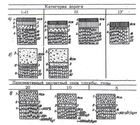 Принципиальные схемы конструкций дорожных одежд с основаниями из обработанных материалов для покрытай нежесткого типа (а) монолитных цементобетонных покрытий (б) и сборных цементобетонных (в): 1 - асфльтобетон мелкозернистый 2 - асфальтобетон крупнозернистый; 3 - черный щебень; 4 - обработанные материалы; 5 - монолитные цементопокрытия; 8 - выравнивающий слой из сухой цементобетонной смеси марки 50.