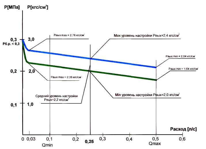 При переходе к гидростатическим напорам и условии, что на верхнем этаже давление перед водоразборным узлом составляет 0,1 МПа: где Q1, Q2 - расход воды через водоразборные узлы ΔР1, ΔР2 - перепады, возникающие на водоразборных узлах, расположенных на разных этажах Δn - разница в этажности между водоразборными узлами Н - высота этажа Δп·Н - разница статического давления kv - коэффициент пропускной способности идентичных узлов Из расчета (1) - (7) следует, что для обеспечения необходимого расхода воды водоразборной арматурой при оптимальном давлении воды в 0,1 МПа разница статических давлений между узлами составляет не более 0,044 МПа (4,4 метра водяного столба). Эта величина обеспечивается, если на каждом этаже здания устанавливается КРД с рекомендованными характеристиками, кроме двух верхних этажей. На двух верхних этажах можно не устанавливать КРД, если: а) давление на последнем этаже соответствует расчетному - 0,1 МПа (0,125 МПа с учетом потерь на водосчетчиках и подводке); б) разница высоты между двумя последними этажами не превышает 4,4 метра. Но, практика показывает, что во время минимального потребления воды нижними этажами (дневной, ночной режимы) давление воды на последнем этаже будет превышать 0,125 МПа, поэтому КРД рекомендуется устанавливать и на двух верхних этажах. Для всех этажей условие (7) обеспечивается заводской настройкой КРД, которая выполняется с учетом потерь в водосчетчиках и трубопроводах. Установка КРД в зданиях общественного назначения, в том числе и встроенно-пристроенных к жилым домам, осуществляется с учетом расчетных напоров и расходов воды на подводках к санитарно-техническим приборам и технологическому оборудованию. 4.2. Устойчивость регулирования КРД Для обеспечения п. 10.9* СНиП 2.04.01-85* по допустимому отклонению расхода ±10 %, (что соответствует отклонению расхода в 1,2 раза) при давлении воды более 0,1 МПа необходимо, чтобы выходное давление за регулятором не изменялось более чем в 1,44 раза во всем диапазоне рабочих расходов. Типовые характеристики регуляторов настроенных на граничные значения Рвых = 0,2 и Рвых = 2,4 МПа (заводская настройка Рвых = 0,22 ± 0,02 МПа) приведены на Рис. 1 (Приложение 1). Возможное максимальное изменение температуры смеси горячей (t = 50°C) и холодной (t = 15°C) воды из-за «ухода» характеристики регулятора от изменения общего расхода в рабочем диапазоне составляет 1,75°С, что является комфортным условием пользования смесительными приборами (например, душем). 4.3. Пропускная способность КРД Этот показатель важен для обеспечения работоспособности бытовых приборов (стиральных и посудомоечных машин), а также для обеспечения комфортных условий эксплуатации (скорость заполнения ванн). В соотвествии с СНиП 2.04.01-85* Приложение 2 «Расходы воды и стоков санитарными приборами» для обеспечения потребности сантехнического оборудования (смесителей, смывных бачков и т.д., а также любого из санитарных приборов) пропускная способность квартирного регулятора давления определена: не менее 0,46 л/с по холодной воде и не менее 0,32 л/с по горячей воде, а в случае падения входного давления ниже уровня настройки регулятора до 0,05 МПа - не менее 0,2 л/с (при этом регулятор полностью открыт и обеспечивается свободный напор в подводках при наличии аэраторов на смесителях). 4.4. Нормативная база по применению КРД Основой для выработки рекоменда