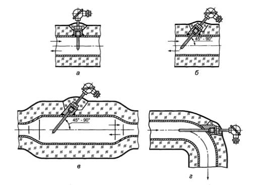 Рисунок 1 - Схема расположения чувствительного элемента преобразователя температуры: а - радиальное; б - наклонное; в - в расширителе; г - в изгибе колена 7.5 Измерение плотности, состава и удельной объемной теплоты сгорания газа 7.5.1 Измерение плотности газа при рабочих условиях Измерение плотности газа при рабочих условиях проводят в соответствии с требованиями технической документации на применяемые плотномеры. Для измерения плотности измеряемого газа в рабочих условиях допускается применение плотномеров любого типа, учитывающих изменение состава газа, его температуру и давление в месте измерения. Отслеживание изменения плотности газа обеспечивают созданием потока газа через чувствительный элемент плотномера. Устройства, применяемые на входе плотномеров для очистки проб от примесей (фильтры и осушители), не должны изменять основной состав измеряемого газа. Расстояние между счетчиком и пробоотборным устройством плотномера или его чувствительным элементом, в случае их размещения непосредственно в ИТ, должно быть не менее минимально необходимой длины прямого участка. В этом случае исключается влияние искажений структуры потока газа, обусловленных установкой пробоотборного устройства плотномера или его чувствительного элемента в ИТ, на показания счетчика. В общем случае давление и температура, а следовательно, и плотность газа в чувствительном элементе плотномера отличаются от значений этих параметров в месте отбора давления и измерения температуры. Показания плотномера корректируют на разность (Δ) давлений и температур в плотномере и местах их отбора по формуле
