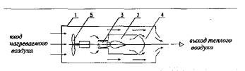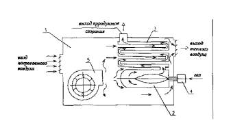 Рис. 3. Схема газового нагревателя воздуха (теплогенератора) (ГНВ-ТГ) 1 - воздушная камера; 2 - камера сгорания; 3 - теплообменник; 4 -горелочный блок; 5 - вентилятор Принципиальная схема газового конвектора приведена на рис. 4. 4.5 Газовый нагреватель воздуха смесительного типа (ГНВ-СТ) состоит из комбинированного газового блока с автоматикой, камеры сгорания, камеры смешения, вентилятора с двигателем. В зависимости от конструкции применяемой горелки камеры сгорания и смешения могут быть объединены в одну камеру, в которой горение газа и частичное или полное смешение продуктов сгорания газа с воздухом происходят одновременно. Принципиальная схема воздухонагревателя газового смесительного типа приведена на рис. 5. 4.6 Конструкция газового оборудования и материалы для его изготовления должны обеспечивать надежность, долговечность и безопасность эксплуатации в течение расчетного ресурса работы, принятого в технических условиях и государственных стандартах, а также возможность его ремонта, замены отдельных узлов (блоков). 4.7 Детали, работающие в условиях агрессивных сред, должны быть изготовлены из коррозионно-стойких материалов или иметь антикоррозийное покрытие. Детали, работающие при температуре свыше 500°С, должны быть изготовлены из окалиностойкого материала или иметь окалиностойкое покрытие. 4.8 Конструкция горелок, входящих в состав основных частей нагревателей, должна предусматривать непрерывную подачу воздуха в количестве, необходимом для полного сгорания газа и его устойчивого горения. 4.9 Конструкция горелок должна предусматривать возможность выполнения операций управления горелкой без применения средств индивидуальной защиты рук.