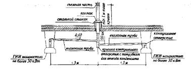 Рис. 7. Последовательное подключение ГИИ-Т 10.6 Параллельное подключение нескольких установок ГИИ к сборной стальной дымоотводящей трубе (дымовому каналу), как правило, производится при использовании централизованной системы удаления продуктов сгорания. Для обеспечения равномерного удаления продуктов сгорания устанавливается общий вытяжной вентилятор. Подключение ГИИ к сборному каналу следует предусматривать посредством воронок. Диаметры воронок предусматриваются в 2 раза больше диаметров газовых выхлопов от ГИИ. Сборный воздуховод следует прокладывать с уклоном не менее 0,02. В нижней части дымового канала необходимо устанавливать штуцер для отвода образующегося конденсата (рис. 8). 10.7 При присоединении к общему дымовому каналу нескольких аппаратов, не имеющих стабилизаторов тяги, на дымоотводящих трубах от установок должны предусматриваться шиберы, заслонки, имеющие отверстия диаметром не менее 15 мм. 10.8 Присоединение газовых нагревателей к дымоходам следует предусматривать трубами с диаметром, равным диаметру дымоотводящего патрубка нагревателя или превышающим его. 10.9 Допускается предусматривать последовательное подключение к общему дымовому каналу ГНВ, расположенных на разных этажах здания с количеством этажей не более пяти. 10.10 Расстояние от ГНВ до дымового канала должно быть не более 3м. Горизонтальный участок присоединительной трубы должен быть выполнен с уклоном не менее 0,01 в сторону газового аппарата, в соответствии с требованиями СНиП 42-01-2002. На дымоотводящих трубах допускается предусматривать не более трех поворотов с радиусом закругления не менее диаметра трубы. 10.11 Ниже места присоединения трубы, отводящей продукты сгорания от газового аппарата, на дымовых каналах должно быть предусмотрено устройство "кармана" с люком для чистки, к которому должен быть обеспечен свободный доступ или крышка с патрубком для отвода конденсата.