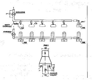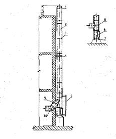 Рис. 9. Узел наружного дымового канала; 1 - оголовок; 2- звено дымохода; 3 - хомут; 4 - стеновое крепление; 5 - защитное ограждение; 6 - элемент прочистки; 7 - отвод конденсата; 8 - тройник 90°С; 9 - тройник 90°С; 10- полуотвод 45 *С 11 ТРЕБОВАНИЯ К ОТОПЛЕНИЮ И ВЕНТИЛЯЦИИ11.1 Системы отопления и обогрева с ГИИ следует применять в помещениях, оборудованных системами приточно-вытяжной вентиляции. 11.2 При проектировании вентиляции в помещениях, оборудованных ГИИ, помимо расчета воздухообменов по технологическим вредностям, должен выполняться расчет из условия допустимых концентраций СО и NO2 в воздухе рабочей зоны и на рабочих местах, расположенных выше уровня установки ГИИ (крановщики, монтажники и др.) в соответствии с требованиями ГОСТ 12.1.005-88 и ГН 2.2.5.686-98. 11.3 Размещение вытяжных устройств следует предусматривать выше излучателей (горелок), а приточных устройств - вне зоны излучения горелок. 1.4 Раздача приточного воздуха должна быть организована таким образом, чтобы приточный воздух поступал в рабочую зону без перемешивания с продуктами сгорания. 11.5 Плотность размещения, высота подвеса, а также интенсивность работы ГИИ при размещении в обслуживаемом помещении должны определяться исходя из конкретных микроклиматических условий и технологических процессов, в соответствии с гигиеническими требованиями. 11.6 Системы воздушного отопления и системы приточной вентиляции, совмещенные с воздушным отоплением, при использовании ГНВ следует предусматривать с резервным вентилятором или не менее чем с двумя установками. Производительность резервного вентилятора принимается равной производительности основного. 11.7 Коэффициент рециркуляции воздуха в системах отопления и вентиляции с применением ГНВ определяется технологическими требованиями к микроклиматическим условиям, конструкцией установки, объемом обслуживаемого помещения и обеспечением подачи наружного воздуха по требованиям СНиП 41-01-2003. 11.8 Не допускается применение ГНВ-СТ для отопления помещений, в которых возможно постоянное пребывание людей. 11.9 Качество сжигания газа в ГНВ-СТ и количество воздуха, используемого для смешивания с продуктами сгорания газа, должны обеспечивать образование смеси, в которой концентрация вредных веществ в выходном патрубке не превышает 30% предельно допустимых концентраций (ПДК) СО и NОх в воздухе рабочей зоны производственных помещений. 11.10 В помещении, которое отапливается ГНВ-СТ, должны быть обеспечены непрерывный контроль воздуха рабочей зоны на наличие СО и NOх и сигнализация о превышении их ПДК. 11.11 Помещение для размещения ГНВ должно иметь естественное освещение и постоянно действующую приточно-вытяжную вентиляцию с кратностью обмена воздуха в соответствии со СНиП 41-01-2003, но не менее трехкратного воздухообмена в 1ч. 11.12 Устройство воздухозабора для приточных систем с ГНВ необходимо предусматривать из мест, исключающих попадание в систему вентиляции взрывоопасных паров и газов во всех режимах работы. 11.13 При проектировании системы отопления в помещении для размещения ГНВ, работающих без постоянного обслуживающего персонала, расчетная температура воздуха принимается + 5 и + 10°С - при пребывании работающих не более 2ч в смену в холодный период года. 11.14 Воздуховоды систем приточной вентиляции и воздушного отопления должны соответствовать требованиям СН